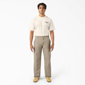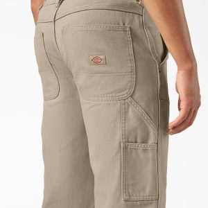 Double up on authentic workwear styling with these men’s double knee canvas pants. The classic staple is crafted from rugged. 100% cotton canvas and features a loose fit and straight leg. The pants are equipped with durable double knee panels. a functional hammer loop. ruler pocket. extra tool pocket. and antique brass button closure.