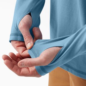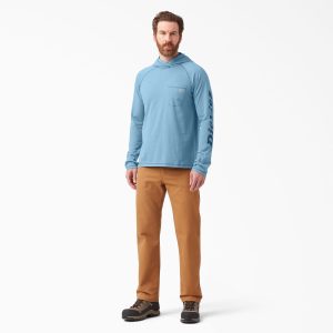 Stay cool for peak performance during warm weather workplace conditions with Dickies Men’s Cooling Performance Sun Shirt. Our Temp-iQ® intelligent advanced cooling technology regulates body temperature to keep you cool and dry. The sun is no match for the UPF 40+ protection embedded into the moisture-wicking fabric. Long raglan sleeves. complete with Dickies Wordmark logo offer enhanced mobility and coverage. featuring anchor thumbholes to keep sleeves perfectly in place. There’s extra protection for your head and neck whenever you need it. with a built-up neckline and three-piece hood. Use the chest pocket with pencil divider when on the job.
