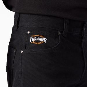 The Dickies × Thrasher Collection celebrates skateboarding culture. Crafted from 100% cotton duck canvas. these rugged pants feature double knee reinforcements for added durability. The pants feature a cell phone pocket. lined pocket bags. and co-branded embroidery at the coin pocket.
