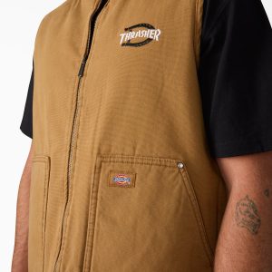 The Dickies × Thrasher Collection celebrates skateboarding culture. This durable vest is a reversible style crafted from rugged. 100% cotton duck canvas and a barbed wire printed interior lining. The vest has interior pockets. metal rivets and trims. and co-branded chest embroidery.