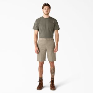 Take your workwear to the next level with the Men’s Relaxed Fit Work Shorts. 11. The shorts hit around the knee. engineered in ultra-durable. FLEX material with an easy-care stain release finish to stand up to the challenges of a work environment. Designed with ease in mind. the relaxed fit offers unrestricted movement and superior comfort throughout your work day. Moisture-wicking technology keeps you fresh and dry when you need it. and the wrinkle-resistant design won’t crease under pressure. There’s a convenient cell phone pocket to keep your device at hand. and additional pockets for your work items.