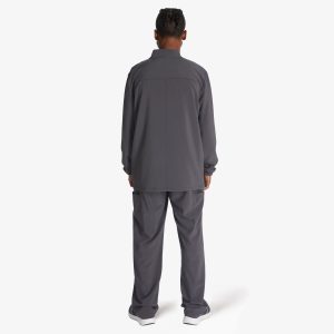 This Men’s fit full zip front jacket has a stand-up collar. stylized front seams. and a center back seam. There are three pockets for storage: an in-seam chest pocket and two front pockets. The sleeve hems are finished with interior elastic cuffs.
