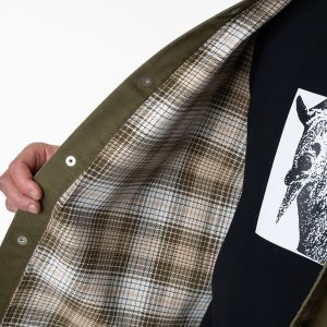 For his Pro Collection. Mike Anderson—the blueprint for skate-anything skateboarders—took inspiration from classic styles he’s been wearing since childhood and added custom details tailored for skateboarding. The lined shacket features a relaxed fit. flannel lined interior. elbow patches. side seam waist pockets. and a snap front closure. Mike uses a goat graphic as his signature hidden under the placket in homage to his pet goat Snowflake.