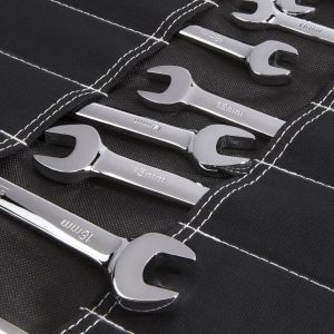 Expertly store your tools with the Dickies Work Gear 57061 Small Wrench / Tool Organizer Roll. This handy black fabric tool roll features 16 individual pockets that can hold your wrenches. ratchets. precision screwdrivers and any other hand tools you might have. Made of durable and rip-resistant cotton canvas it features fold-over protective flaps to keep your tools in place during transport between jobs. and with its convenient roll-up design. you can easily pick up and go. The reinforced drawstring ties keep the roll secured shut. and the webbed handle makes carrying a breeze.