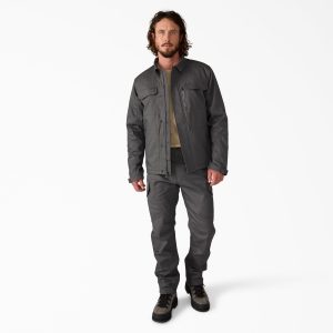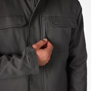 The Tradebuilt collection offers utility performance workwear designed for specialized trades. Our Tradebuilt men’s shirt jacket is built from rugged duck canvas with just enough stretch to enable mobility. It has a brushed mesh lining on the interior for breathability. a snap and zipper front closure. snap-close chest pockets. and a Durable Water Repellent finish to help keep you dry in misty weather conditions.