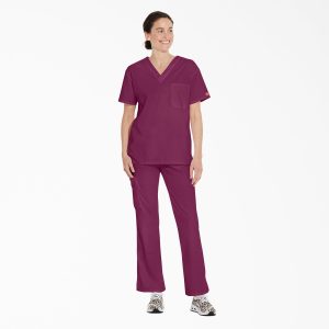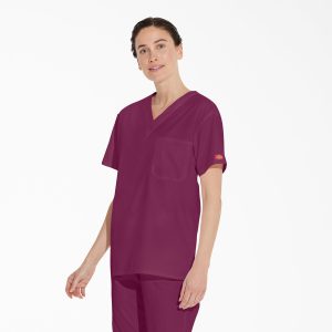 Unisex Fit. V-neck top features Dickies logo twill tape at the back neck. a front chest pocket with a bar-tacked pencil slot and side vents. This style looks great tucked in or untucked.