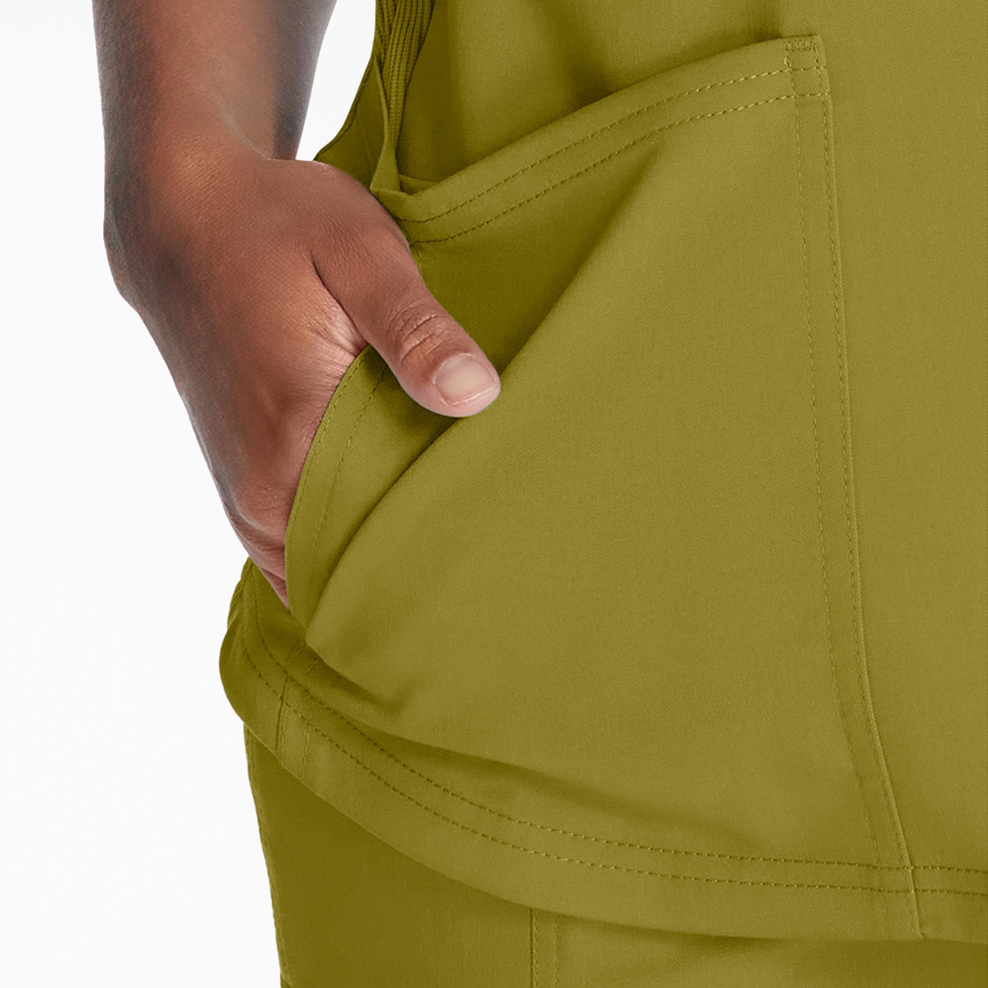 This Contemporary fit. short sleeve V-neck top has two roomy patch pockets. two side seam pockets. secured zip pocket along with comfort knit at front and back side panels. It also features front and back yoke seams with a bungee loop at the right front yoke seam. Shirttail hem gives a flattering look.