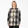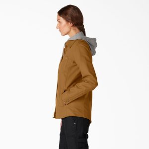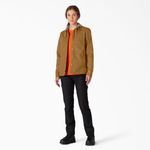 Discover the most versatile outer layer that delivers on the promise of warmth. durability and protection in Dickies Women’s Duck Hooded Shirt Jacket. Combining the lived-in feel of a hoodie. the strength of a duck canvas work shirt and the security of a jacket. this workday essential will check the box for function and style. Featuring a sturdy brushed duck canvas fabrication and equipped with a cozy jersey lining and hood. you’ll embrace the cold climate with ease in this shirt jacket. You’re covered in wet weather too. as the DWR finish ensures water repellency to keep you dry. Durable metal snap closures at front and a drop tail hem offers even more protection when your work climate calls for it. Maximum utility comes standard with two large chest pockets and two side welt pockets to store all that you carry.
