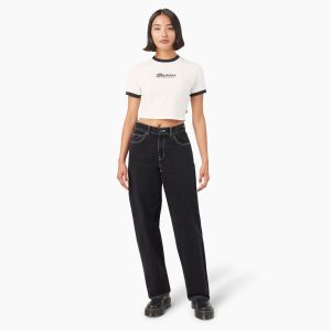The Lewistown women’s ringer tee features a slim fit. cropped length. and contrasting neck and sleeve ribbing. The t-shirt is crafted from a cotton blend with just enough stretch for comfort. It’s finished with a small script graphic inspired by the Dickies logo for a retro look.