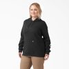 Dickies’ Women’s Plus Water Repellent Sleeve Logo Hoodie is made of fleece. so it feels cozy and comfortable. Yet it’s as strong and durable as you. This plus size hoodie features the same design as our regular women’s hoodie. Double-needle stitching and the Durable Water Repellent (DWR) finish add strength and protection on wet days. The crossover neckline. three-piece adjustable hood. and rib-knit waist and cuffs add strength. durability. and comfort. even in rough weather conditions. Use the front kangaroo pockets to store small work essentials–or just to keep your hands warm. The Dickies Wordmark graphic logo adds style.
