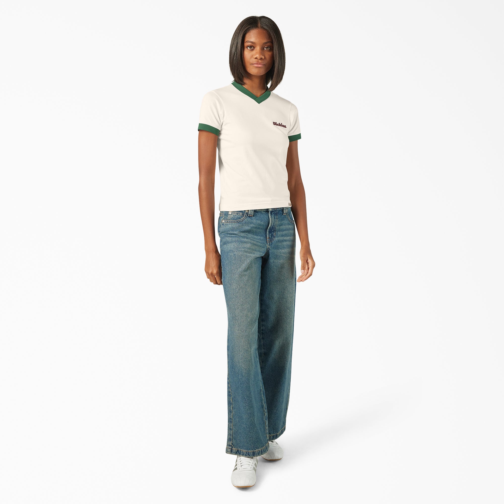 Give your t-shirt rotation a retro update with the Slayden women’s t-shirt. The v-neck tee features a slim fit. cotton-blend jersey fabric with stretch for comfort. contrast neckline and sleeve cuffs. and a subtle script logo on the left chest.