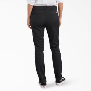 Whether you’re working or not. make it a comfortable day with Dickies’ Women’s Slim Fit Straight Leg Pants. Sitting just below the waist. these skinny-fit pants have a straight leg you so you can keep up with current styles. The stretch twill fabric is made of just enough spandex to let you move in all directions. The contoured waistband has a unique stretch interlining so you won’t have gapping in the back—a perfect fit for looks and comfort.