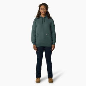 Dickies’ Women’s Water Repellent Sleeve Logo Hoodie is constructed from soft fleece and has a relaxed fit. so it feels cozy and comfortable. Yet it’s as strong and long-lasting as you. Double-needle stitching and the Durable Water Repellent (DWR) finish add strength and protection. so you can wear this hoodie in wet conditions. The crossover neckline. three-piece adjustable hood. and rib-knit waist and cuffs add strength and durability. even in rough weather conditions. Use the front kangaroo pockets to store small work essentials–or just to keep your hands warm. The Dickies Wordmark graphic logo on the left sleeve adds a touch of style.