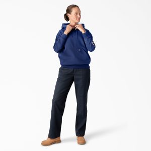 Dickies’ Women’s Water Repellent Sleeve Logo Hoodie is constructed from soft fleece and has a relaxed fit. so it feels cozy and comfortable. Yet it’s as strong and long-lasting as you. Double-needle stitching and the Durable Water Repellent (DWR) finish add strength and protection. so you can wear this hoodie in wet conditions. The crossover neckline. three-piece adjustable hood. and rib-knit waist and cuffs add strength and durability. even in rough weather conditions. Use the front kangaroo pockets to store small work essentials–or just to keep your hands warm. The Dickies Wordmark graphic logo on the left sleeve adds a touch of style.