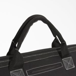 When you put the Dickies Work Gear 20-Inch Work Bag to the test. you’ll never be disappointed with the results! Constructed of durable black canvas. this tool/work bag features a large main compartment with a wire-reinforced opening for easy access to your tools and accessories. Interior measures 20-inches long. 11-inches wide and 9-inches tall when zipped closed and 11.5-inches tall if the main compartment is left open to hold larger or bulkier power tools. There are 6 roomy interior pockets that can hold a variety of supplies. On the exterior. there are 7 webbing and rivet reinforced pouch pockets and a smaller accessory pocket. The heavy-duty zipper closure secures your tools in place when you’re ready to pack up. and the D-ring attached padded shoulder strap is fully adjustable and allows for the easy and comfortable transport of heavier loads.